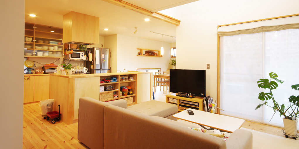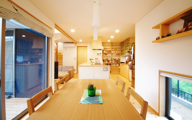 キッチンを軸としたL字のプランとすることで、ひとまつながりの空間にもリズムが生まれました。