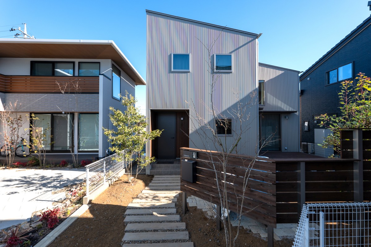 旗竿状敷地で東と南は隣家がせまる条件のなかで、L字型平面としてプライベートな庭を確保しつつ大きな吹抜のハイサイドライトからたっぷり光が降り注ぐ、明るいリビング空間をつくりました。