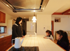 まず、受け取ったプランの大幅な変更にIさんは大変驚いたそうです。それまでは各部屋を廊下でつないでいる構成だったものを、自然と住まい研究所は、アイランドキッチンを中心に、家族がひとつになれるような空間を提案したのです。使わない和室をやめて、広々としたリビングに…。「おかげで、家族が自然とリビングに集まってくるようになったりました」とIさんはいいます。